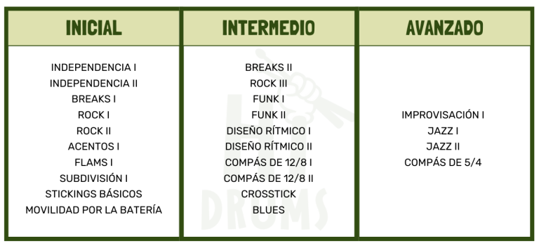 *todos los Mini-Cursos están incluidos en los niveles del Curso Completo de batería en función de su nivel de dificultad.